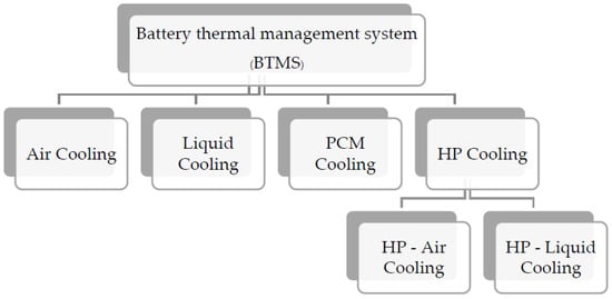 A well-designed BTMS is necessary to ensure that batteries are working in suitable operating conditions [13]. In the design of a BTMS, safety, ease of maintenance, size, weight, and potential applications have to be taken into account [14]. BTMSs have been categorized into four main groups: air cooling, liquid cooling, phase change material cooling, and heat pipe cooling, as shown in Figure 1.