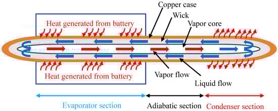 A heat pipe-based battery thermal management system (HP-BTMS) is one of the technologies that meets almost all the required conditions for a BTMS, ensuring that the battery operates at an optimal temperature. The advantages of such a system are its high heat transfer rate, low weight, compact size, low cost, long life, and high capacity for moving heat from the inside of the battery pack to the outside [30]. Moreover, the heat pipe structure in the condenser section can be coupled with forced air [31] or a water spray [32] to ensure maximum performance. Some investigators have coupled an aluminum fin to the condenser to enhance the heat transfer rate [33]. However, with an HP-BTMS, a problem still exists with keeping the battery temperature within the optimum range, especially when the charge/discharge rate is high. Some researchers have used plate flat heat pipes for BTMSs to obtain temperature uniformity of the battery pack [34,35,36].
