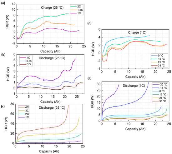 Measurement results of heat generation rates at different C rates during (a) charging rates of 1 C, 1.5 C, and 2 C at Tamb 25 °C; (b) discharging rates of C/3, 0.5 C, and 1 C at Tamb 25 °C; (c) discharging rates of 1 C, 2 C, 3 C, and 4 C at Tamb 25 °C; (d) charging rate of 1 C at Tambs of 0 °C, 15 °C, 25 °C, and 35 °C; and (e) discharging rate of 1 C at Tambs of 30 °C, 15 °C, 0 °C, 15 °C, 25 °C, and 35 °C (from Hu et al. [6], with permission from Elsevier).