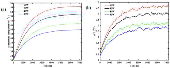 The variation of (a) Tmax and (b) ΔT at different input powers and a mass flow rate of 0.0167 kg/s (from Mbulu et al. [5], with permission from Elsevier).