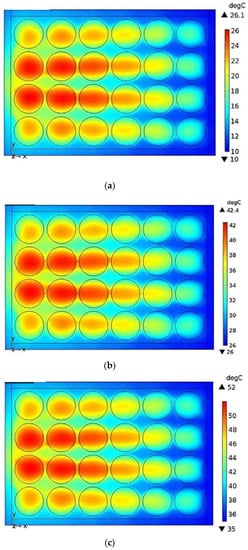 Behi et al. [52] carried out an experimental study to analyze the impact of the Tamb of the air on a battery module’s temperature distribution, as shown in Figure 5. The researchers investigated three ambient temperatures: 10, 26, and 35 °C. The experiment clearly proved that the Tamb of the air has a critical effect on the temperature distribution of a battery. When the Tamb is low, the temperature distribution on the battery surface decreases.
