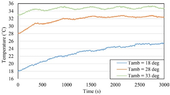 Alihosseini and Shafaee [53] analyzed a battery’s thermal performance based on winter and summer temperatures of 18, 28, and 33 °C, as shown in Figure 6. In this experiment, the Tamb was adjusted and controlled in a test chamber. Li et al. [54] studied the effects of the Tamb on the Tmax and ΔT. They found that a high Tamb will cause the Tmax to rise above the optimal temperature and cause the HP-BTMS’s thermal performance to decrease. Meanwhile, the ΔT of the battery decreases when the Tamb increases. This result implies that a low Tamb will elevate the ΔT.