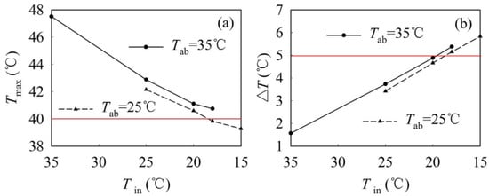 (a) Tmax and (b) ΔT of a battery under different inlet coolant temperatures with an input power of 40 W and flow rate of 2 LPM (from Liang et al. [39], with permission from Elsevier).