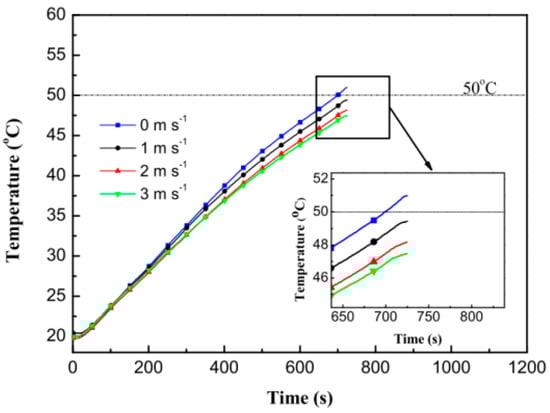 Wu et al. [56] investigated the effects of air velocities between 0 and 3 ms−1 with a battery discharge rate of 5 C, as shown in Figure 9. They found that the Tmax decreased with the rising air velocity. However, when the air velocity increased further, the Tmax decreased at a lower rate due to the limitation of the phase transition process.