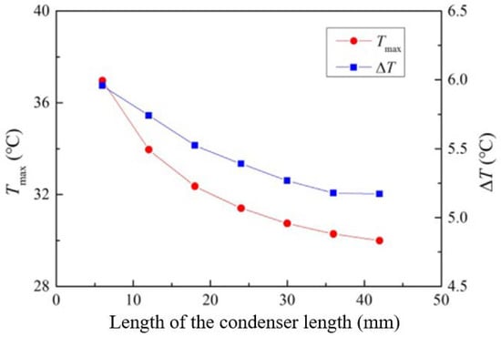 Gan et al. [41] investigated the condenser length’s effects on a BTMS’s cooling performance. When the condenser length was increased from 6 to 42 mm, the Tmax and ΔT decreased by 6.97 and 0.79 °C, respectively, as shown in Figure 12. Although the heat transfer area increased with an increased condenser length, an increase in length might cause the HP-BTMS’s weight to increase. Therefore, selecting the appropriate condenser length enhances the BTMS’s cooling performance.