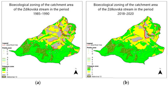 (a) Bioecological zoning of the catchment area of the Zdíkovský stream in the period 1985–1990; (b) Bioecological zoning of the catchment area of the Zdíkovský stream in the period 2018–2020.