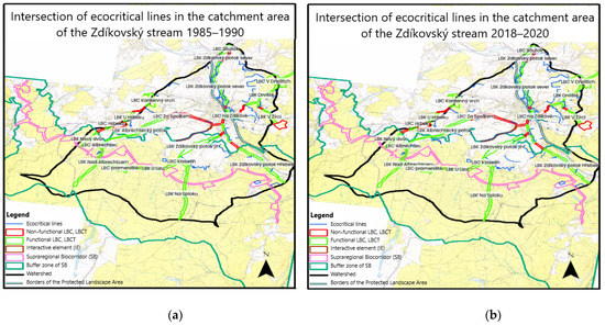(a) Intersection of ecocritical lines in the catchment area of the Zdíkovský stream in the period 1985–1990; (b) Intersection of ecocritical lines in the catchment area of the Zdíkovský stream in the period 2018–2020. Legend: LBC–local biocorridor; LBCT—local biocentre.