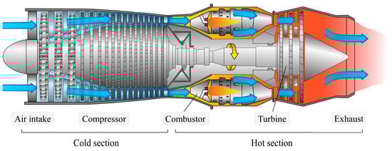 Gas turbines have many applications such as aircraft and marine propulsion, electricity generation, and mechanical drive [1]. A sectional view of a turbojet engine is shown in Figure 1 [2]. It consists of five parts, i.e., air intake, compressor, combustor, turbine, and exhaust nozzle. The combustor liners and the first-stage turbine vanes and blades are the main hot section components [3].
