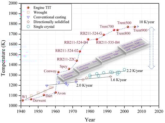 Evolution of the TIT of Rolls-Royce’s civil aero-engines, the maximum allowable temperature of nickel-base superalloys, and the thermal protection techniques. Data collected from [9,10,11].