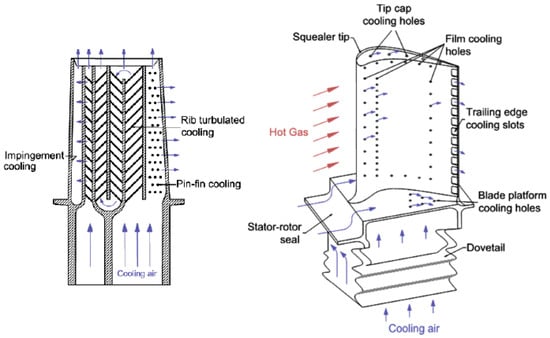 Typical cooling system for modern gas turbine blades. Adapted with permission from [20]. Licensed under a Creative Commons Attribution (CC BY) license.