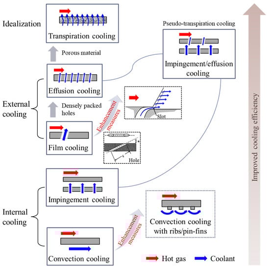 Figure 4 shows an overview of advances in turbine blade cooling schemes from the simple convection cooling to the transpiration cooling with the improved cooling efficiency level. To make the simple convection cooling more efficient, various enhancement measures were proposed [28,29,30]. It is known that high heat transfer rate can be obtained by impinging jets [31,32,33,34,35,36]. Thus, impingement cooling is usually adopted to enhance the internal cooling performance. Even so, an inherent disadvantage of internal cooling schemes is that the external surfaces of turbine blades are directly exposed to the hot gas. Yet for effusive cooling schemes, a cooling film is built above the blade external surface, thus reducing the heat transfer into the blade [37,38,39]. An ideal film cooling design is ejecting the coolant through a tangent slot [40,41,42], but turbine blades with the continuous two-dimensional slots may suffer the structural strength loss. Thus, film cooling with discrete holes is commonly used instead. Various enhancement measures have been developed to promote the film cooling efficiency [43,44]. As the number of cooling holes increases, film cooling transits to effusion cooling [45,46]. Effusion cooling aims at providing cooling films fully covering the hot-side surfaces of a turbine blade [47,48]. Theoretically, effusion cooling becomes transpiration cooling, when the hole diameter and the hole spacing are small enough [49,50]. Practically, effusion cooling involves a perforated plate with multirow holes, while transpiration cooling involves porous materials. Transpiration cooling is believed to be the goal of turbine cooling design due to its superior cooling performance [51,52]. The investigation of transpiration cooling began in the early 1950s [53,54,55], but its commercial use in turbine blades is limited due to the concerns of structural strength and manufacturability [51,56]. Laminated cooling schemes that combined the advantages of internal and external cooling were developed in the early 1980s, such as Lamilloy [57], Transply [58], and the impingement/effusion cooling [59]. These cooling schemes are regarded as the approximation of transpiration cooling due to their high cooling efficiency, and they are also called pseudo- or quasi-transpiration cooling. Nowadays, additive manufacturing (AM) [60,61] enables the freedom of designing and fabricating porous materials, which makes transpiration cooling closer to the practical application in turbine blades [62,63].