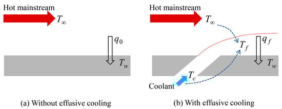With effusive cooling (Figure 5b), the local heat flux from the mainstream to the wall is given by [37,67]
