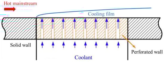 The principle of effusion cooling is sketched in Figure 6. Coolant is discharged into the hot mainstream boundary layer through densely packed cooling holes. Owing to the insulating effect of the cooling film and the forced convection inside the cooling holes, the perforated plate temperature is lowered. It was found that significant interactions between upstream and downstream coolant jets existed in effusion cooling [71,72]. Harrington et al. [73] showed that due to the coolant superposition, the adiabatic effusion cooling efficiency was increased with the downstream location. An asymptotic “fully developed” adiabatic effusion cooling efficiency level was reached downstream of the eighth row of cooling holes. Scittore et al. [74] found that a fully developed velocity profile was reached downstream of the fifteenth row of cooling holes. In a word, the study of traditional film cooling with one or two rows of cooling holes could not provide data that were valid for effusion cooling [46].