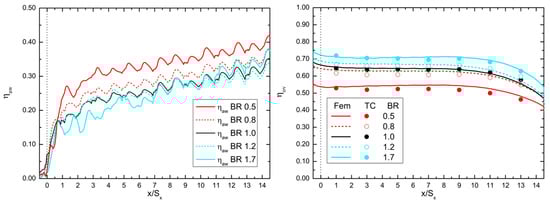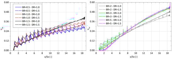Harrington et al. [73] found that the coolant jets remained attached to the surface for BR = 0.25, while the separation of coolant jets from the surface was evident for BR ≥ 0.65. Facchini et al. [75] found that increasing the blowing ratio from 0.5 to 1.7 caused a decrease in the adiabatic effusion cooling efficiency due to the occurrence of coolant jet lift-off, while it led to a higher overall effusion cooling efficiency although the increment tended to slow down (Figure 7). This suggested that the convective heat transfer within cooling holes contributed to the overall effusion cooling efficiency. Figure 7 also showed a measurable effect of thermal conduction upstream of the first cooling row, which resulted from the high thermal conductivity of the effusion plate [79]. Wang et al. [76] studied the adiabatic effusion cooling efficiency of a flat plate at the blowing ratios from 0.4 to 2.0. The measurements showed that for BR < 0.8, the adiabatic effusion cooling efficiency increased with BR. While for BR > 0.8, it decreased with BR. Bazdidi-Tehrani and Andrews [77] found that the effect of density ratio in the range of 1.0–3.2 on the overall effusion cooling efficiency was small. The influence of density ratio on the adiabatic effusion cooling efficiency is shown in Figure 8 [78]. For the lifted-off jets (BR > 2.0), the adiabatic effusion cooling efficiency was weakly affected by DR. However, the efficiency was deeply influenced by DR under blowing ratios below 2.0.