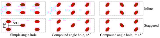In general, the more densely holes are packed, the closer effusion cooling is to the transpiration cooling, and the better cooling performance [79,80,81]. Gustafsson and Johansson [79] found that the cooling efficiency increased markedly with a reduction in hole spacing. Huang et al. [80] found that for 0.5 mm diameter holes, the temperature distribution was more uniform than that for 1 mm diameter holes. Murray et al. [81] found that cooling holes with close spacing had strong lateral jet interactions and could provide a near-full-coverage cooling film.