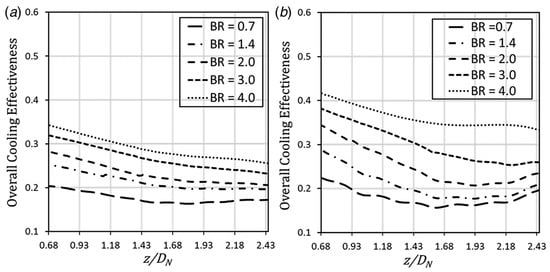 Lateral-averaged overall effusion cooling efficiency of the combustor liner: (a) inline arrangement and (b) staggered arrangement. Reprinted with permission from [84]. Copyright 2021 ASME.
