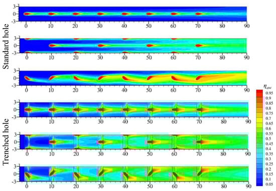 Regarding compound angle holes, Bashir et al. [86] showed that for holes with the same orientation angle, the staggered arrangement resulted in better cooling film coverage than the inline arrangement. Paitich et al. [87] suggested that for the staggered arrangement, the optimal compound angle was between 30° and 60°. However, for holes with opposite compound angles (Figure 9), Wang et al. [88] found that the inline arrangement gave the best adiabatic effusion cooling efficiency. Thus, when designing the effusion cooling configuration, the effects of hole arrangement and hole orientation should be considered together. Effusion cooling performances with trenched holes were also investigated in [88]. The results showed that the trenched holes always provided higher adiabatic effusion cooling efficiency than the standard holes (Figure 11). The flow patterns for various configurations were shown in Figure 12. It was found that trenched holes with opposite compound angles provided more homogenous coolant distribution than other cooling configurations. Figure 13 showed the corresponding flow structures involved in the various effusion cooling configurations. Wei et al. [89] measured the adiabatic cooling efficiency and the discharge coefficient of effusion cooling with cylindrical holes and fan-shaped holes. It was found that the fan-shaped holes had obvious advantages in comparison with the cylindrical holes. Natsui et al. [90] found that for effusion cooling with cylindrical holes, an increase in blowing ratio from 0.44 to 0.60 caused a decrease in lateral-averaged adiabatic cooling efficiency throughout most of the arrays. However, for effusion cooling with fan-shaped hoes, there was a continual increase in effectiveness as the blowing ratio was increased (Figure 14).