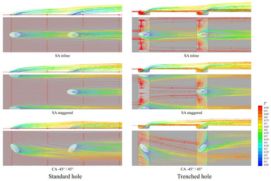 Streamlines colored by the dimensionless temperature for various effusion cooling configurations. Reprinted with permission from [88]. Licensed under a Creative Commons Attribution (CC BY) license.
