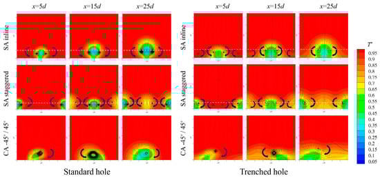 Dimensionless temperature contour overlaid with streamlines in the specific cross sections of various effusion cooling configurations. Adapted with permission from [88]. Licensed under a Creative Commons Attribution (CC BY) license.