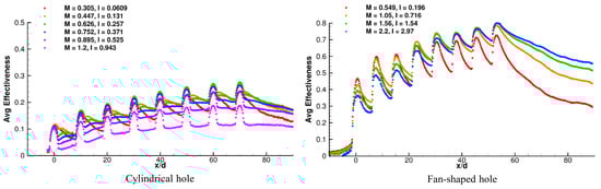 Lateral-averaged adiabatic effusion cooling efficiency with cylindrical holes and fan-shaped holes under various blowing ratios. Adapted with permission from [90]. Copyright 2017 ASME.