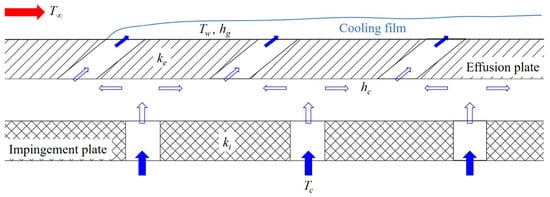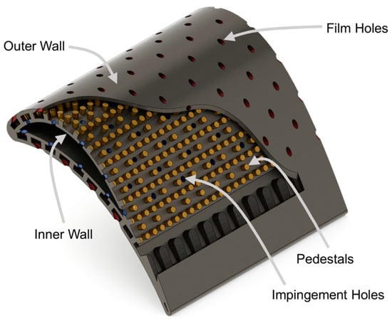 Impingement/effusion cooling is also called double-wall cooling because it incorporates an impingement plate and an effusion plate. A sketch of the double-wall cooling principle is shown in Figure 15. The coolant flows through the impingement holes and impinges on the cold-side surface of the effusion plate. Then, the spent coolant convects within the internal passage between the two plates. Finally, it is discharged from the effusion holes and builds a cooling film to protect the hot-side surface of the effusion plate. A general design philosophy of the double-wall cooling is to maximize the internal heat transfer before the coolant forms the cooling film. In this sense, the enhancement measures and innovative design of internal cooling [63,64] can be borrowed in the double-wall cooling design. Figure 16 shows a conceptual design of a double-wall cooled turbine blade [99]. In the internal passage, pin or pedestal arrays are installed to enhance the internal convective cooling by increasing the wetted area and the flow turbulence. The pin or pedestal arrays also mechanically and thermally connect the two walls.