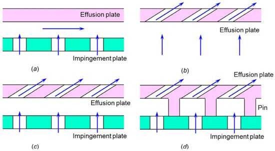 Various cooling configurations: (a) pure impingement cooling, (b) pure effusion cooling, (c) double-wall cooling, and (d) double-wall cooling with pins. Adapted with permission from [100]. Copyright 2019 ASME.