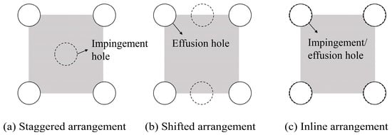 Previous investigations of the double-wall cooling mainly focused on the influencing factors such as the relative arrangement of effusion holes and impingement holes [106,107], the crossflow in the internal passage [108,109], and the pin shape and arrangement [110,111,112]. Three typical arrangement units of effusion and impingement holes, i.e., staggered arrangement, shifted arrangement, and inline arrangement, are shown in Figure 19. Nakamata et al. [106] studied the hole arrangement effect on the double-wall cooling experimentally and found that the cooling efficiency distributions of staggered arrangement and shifted arrangement were nearly the same. Cho et al. [107] measured the heat/mass transfer distributions of double-wall cooling with different hole arrangements. It was found that the area-averaged heat/mass transfer rates on the cold-side surface of effusion plate were almost the same for the staggered and the shifted arrangements, while the heat/mass transfer distribution was more uniform for the staggered arrangement (Figure 20). The heat/mass transfer for the double-wall cooling with the staggered arrangement was a result of jet impingement, flow acceleration into effusion hole, and interaction of wall jets in the midway regions. For the in-line arrangement, most of the impinging flow was discharged directly from the effusion holes, and thus the heat/mass transfer rate was lowest.