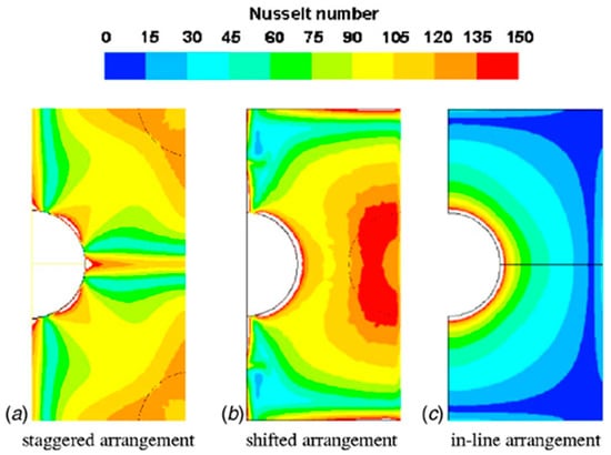 Nusselt number distributions for various hole arrangements. Reprinted with permission from [107]. Copyright 2008 ASME.