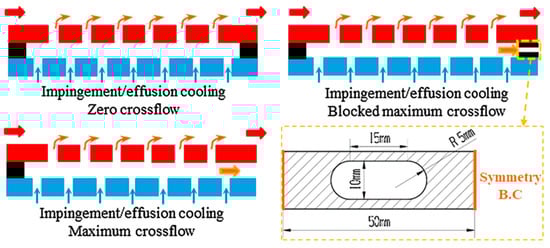 Double-wall cooling configurations with different levels of crossflow. Adapted with permission from [109]. Copyright 2019 Elsevier.