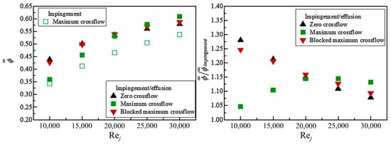 Comparisons of the area-averaged overall double-wall cooling efficiency and the area-averaged overall cooling efficiency ratios related to the pure impingement cooling. Reprinted with permission from [109]. Copyright 2019 Elsevier.
