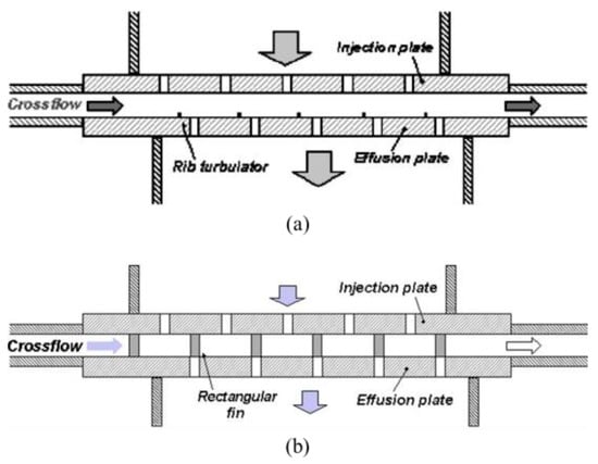 Double-wall cooling with initial crossflow: (a) ribs installed on the effusion plate (reprinted with permission from [111], copyright 2004 ASME) and (b) pins installed between impingement and effusion plates (reprinted with permission from [112], copyright 2007 ASME).