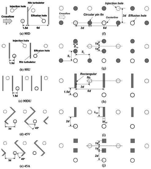 (a–e) Various rib shapes installed on the effusion plate (reprinted with permission from [111], copyright 2004 ASME) and (f–j) various pin shapes installed between impingement and effusion plates (adapted with permission from [112], copyright 2007 ASME).