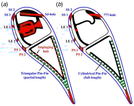 Schematic view of the OSU-vane with different double-wall cooling schemes: (a) impingement cooling with sweeping jet hole and (b) impingement cooling with circular impingement hole. Reprinted with permission from [115]. Copyright 2021 ASME.