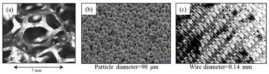 Typical porous material configurations: (a) open-cell metal foam (adapted with permission from [117], copyright 2003 Elsevier), (b) sintered metal particles (adapted with permission from [118], copyright 2012 Elsevier), and (c) sintered woven wire mesh (adapted with permission from [119], copyright 2015 Elsevier).