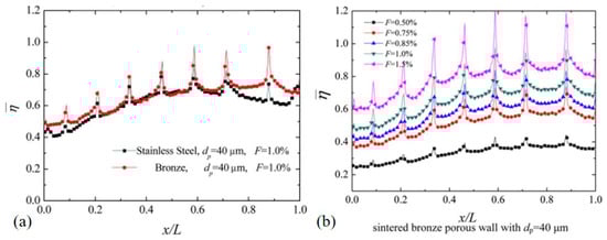 Figure 28 shows three typical porous material configurations, i.e., the open-cell metal foam [117], the sintered metal particles [118], and sintered woven wire mesh [119]. Transpiration cooling with the above porous materials was proved to have high efficiency, and the effects of coolant flow rate and porous media properties were investigated in the experiments [118,119,120]. Aluminum foams with different pore sizes (10–40 pores per inch) but almost identical porosity (92–94%) were tested by Hinse et al. [120]. Results showed that the pore size had negligible effects on the transpiration cooling efficiency when the porous media had a similar high porosity. The sintered porous materials with different solid matrix thermal conductivities were studied in Liu et al. [118]. The results showed that the difference in the cooling efficiency of the porous bronze plate and the porous stainless steel plate was insignificant, while on the porous bronze plate the temperature distribution was more uniform (Figure 29a). The results also showed that even a small amount of coolant usage could provide effective thermal protection, and the cooling efficiency increased with the injection ratio (Figure 29b). The sintered woven wire mesh structures made of stainless steel with different porosities (37–55%) were investigated in Xu et al. [119]. The results showed that the cooling efficiency of test samples with 37% and 46% porosities was almost identical, while for the test sample with 55% porosity, the cooling efficiency was much improved. The characteristics of the turbulent boundary layer on the porous wall in the case of transpiration cooling were investigated by the large-eddy simulation (LES) [121] and the direct numerical simulation (DNS) [122]. Xiao et al. [121] showed that the jelly roll was formed under the interaction between the hot mainstream and the coolant injection. The turbulence modification on the porous wall under various injection ratios was investigated in [122]. As shown in Figure 30, at low injection ratio, the turbulent kinetic energy (TKE) remained unchanged in the transpiration zone. However, at higher injection ratio, the mainstream separated from the wall, and the TKE was greatly enhanced because of the shear interaction between the hot gas and the coolant.
