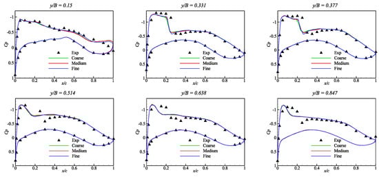 The DLR-F6 wingbody, which served as one of the standard test models in Drag Prediction Workshop II [], is used here for demonstration of the code precision. The design cruise Mach number for DLR-F6 is , and the lift coefficient is . Three sets of mesh are denoted as coarse, medium, and fine. It should be noted that the distances of the first node away from the wall, normalized with friction velocity and molecular viscous, are less than 1 of all meshes, which could provide a proper description of viscous sub-layer.