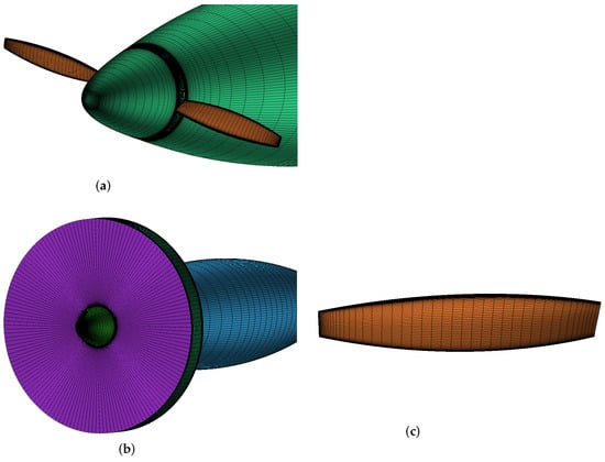 The mesh for the propeller. (a) The mesh detail on the propeller hub. (b) The rotating region around the propeller. (c) The surface mesh of propeller.