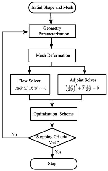 For a optimized system, the mesh deformation, flow solver, and optimization scheme are linked together with the optimization framework which is shown in Figure 5. The optimization algorithm is Sequential Quadratic Programming (SQP) [], which enables the solving of the optimal problem under explicit aerodynamic and geometric constraints, such as minimum lift, minimum volume, maximum pitching moment, and so on.