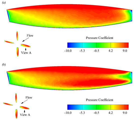 The effect of changing twist angles of profiles on pressure coefficient contour from View A: (a) Baseline; (b) Optimized.