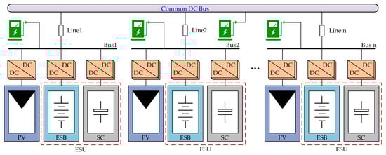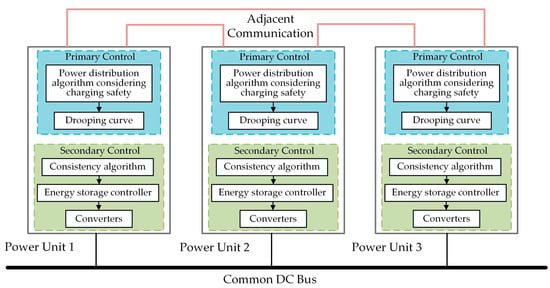 Supercapacitors (SCs) are characterized by a fast response time with high instantaneous output power, which can well compensate for the slow dynamic performance of energy storage batteries (ESBs). Rocabert, J. et al. illustrated the advantages displayed by ESS applications configured with SCs in microgrids [25,26,27]. In contrast, it is difficult to achieve coordinated control between multiple systems using conventional droop control [28]. For this reason, Zhang, X. et al. proposed a hybrid algorithm based on model predictive control (MPC) and iterative learning control to cope with sudden load changes in a PV islanded DC microgrid with a single group of hybrid ESSs [29]. Wu, X. et al. proposed an adaptive energy optimization method for hybrid ESSs in order to maintain the stability of the DC bus voltage, but only for single-group PV hybrid ESSs, without involving multi-system coordinated control [30]. Mathew, P. et al. proposed a multi-stage hybrid control scheme for DC microgrids with hybrid ESSs, combining a central controller with distributed control, while briefly considering the interaction between EV charging stations and the grid [31], but the communication topology of this control scheme is more complex.