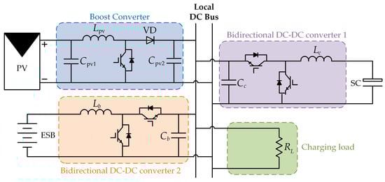 Single-group PV energy storage and charging system model with a boost converter and DC–DC converters.