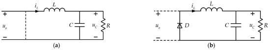 Equivalent circuit schematic of boost circuit in two working modes. (a) Equivalent circuit when the switch is off in the boost circuit; (b) Equivalent circuit when the switch is on in the boost circuit.