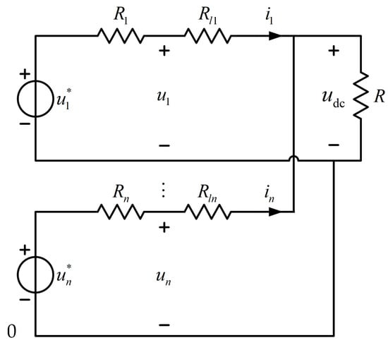 where un is the output voltage of the nth group of the PV energy storage system; is the rated output voltage of the PV energy storage system, i.e., the open-circuit voltage of the PV energy storage system; in is the output current of the PV energy storage system; Rn is the virtual resistance of the system. In Figure 7, Rln is the line impedance of the nth line.
