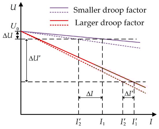 According to Equation (14) above, the system output current is proportional to the sum of the virtual impedance and the line impedance. As shown in Figure 8 below, the mismatch of the line parameters results in the designed conventional droop controller not being able to find a deviation-free solution to the inherent contradiction between accurate power distribution and voltage.