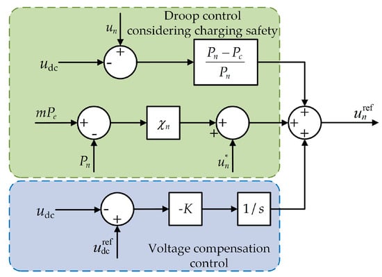 In this section, by considering the charging safety and health factors of charging devices, an improved droop control strategy for the DC microgrid applicable to charging devices is proposed, as shown in Figure 10. The control strategy consists of two parts: the droop control considering charging safety and the voltage compensation control, and it takes into account the impact of the local charging load on the microgrid. To implement the method, it generates reference voltage signals and provides them to the secondary control. This control strategy is locally distributed control, which requires the health information of the charging equipment and the DC bus voltage information. The microgrid system reasonably distributes the power according to the health information of the charging equipment and ensures the voltage quality of the DC bus.