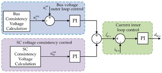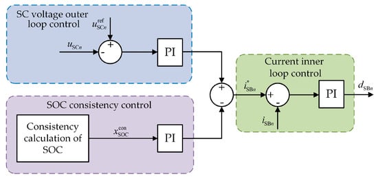 Based on the consistency algorithm, the ESB controller is used to balance the charge state of the ESB. However, when the bus voltage fluctuates, the SC responds quickly to stabilize the bus voltage, and a voltage control loop needs to be incorporated to maintain the end voltage level of the SC. The resulting control strategy to improve the voltage outer loop and current inner loop is shown in Figure 13. The SC voltage control is simultaneously added to the controller outer loop with the SOC consistency control. Its output value corrects the reference current of the ESB, and finally the control target can be achieved.
