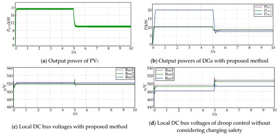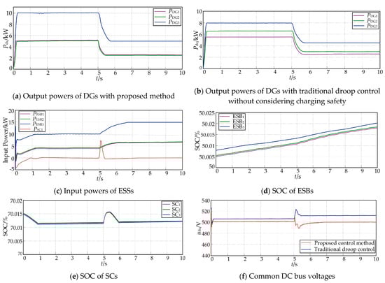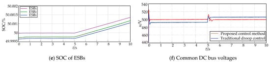 In Figure 15, the DGs should reasonably allocate the load power according to the capacity ratio, so the output power of DG1 and DG2 should be the same and should be 0.5 of DG3. From Figure 15a, it can be seen that before 5 s, DG1, DG2 and DG3 provide 5 kW, 5 kW, and 10 kW load power, respectively. After 5 s, in order to ensure the charging safety of the charging equipment, the charging equipment is operated at reduced power, so DG1, DG2 and DG3 provide 2.5 kW, 2.5 kW and 5 kW load power, respectively. However, as can be seen in Figure 15b, the relative deviation of power distribution reaches more than 30% under the conventional droop control without considering the safety of the charging equipment. Figure 15c shows that the ESS dissipates the excess PV power, the SC can quickly respond to the load change, and the storage battery responds reasonably to the power distribution at the steady state after a certain time. In Figure 15d,e, it can be seen that after the consistency algorithm, the SOC gap between different ESBs becomes smaller. Due to the outer loop control of the SC voltage in the ESB controller, the SOC of the SC remains consistent during the load change. From Figure 15f, it can be seen that the common DC bus voltage is maintained at the rated value of 500 V, which ensures the power supply quality of the charging equipment. On the contrary, the common DC bus voltage with traditional droop control cannot be maintained at the rated value, which reduces the power supply quality and affects the charging safety performance of the charging equipment.