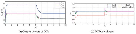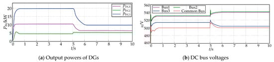 The simulation results under the control strategy proposed in [8] are given in Figure 18. The relative deviations of the power distribution from DG1 to DG3 after 5 s are about 15%, 45%, and 17%. Comparing with Figure 17b, the results in Figure 18a show a large deviation in power distribution because the effect of local load is not considered. In Figure 18b, the common DC bus voltage can still maintain the rated value because of the inclusion of voltage compensation. It is better compared to the common DC bus voltage obtained by the traditional method in Figure 17f. Comparing Figure 17c,d, it is obvious that the local DC bus voltages vary more. This is because the local DC bus voltages are affected in order to meet the load demand. Therefore, the method in this paper is more applicable to the microgrid system where local charging loads exist.
