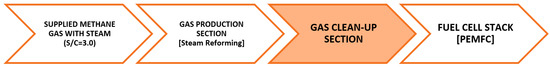A fuel cell system that uses non-hydrogen fuel utilizes the process presented in Figure 1. First, the methane is supplied. Second, the methane is converted into hydrogen (the gas production section). Third, the changed gas is purified in the gas post-treatment process (the gas clean-up section), and finally, the purified gas is supplied to the fuel cell stack.