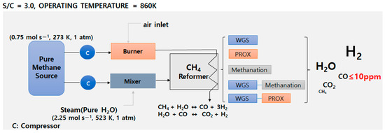 For the simulation of the post-treatment system, a methane steam reforming system was designed using Matlab Simulink and Thermolib [34]. The operating conditions of the steam reforming system for calculating the reformed gas results are shown in Table 1. At a pressure of 1 atm, 0.25 mol s−1 of methane and 0.75 mol s−1 of water vapor were constantly supplied at S/C = 3.0. The supplied methane and steam were reformed at a reformer operating temperature of 860 K. Table 1 shows the results obtained by simulating and calculating the methane steam reforming system obtained based on these conditions and designs.